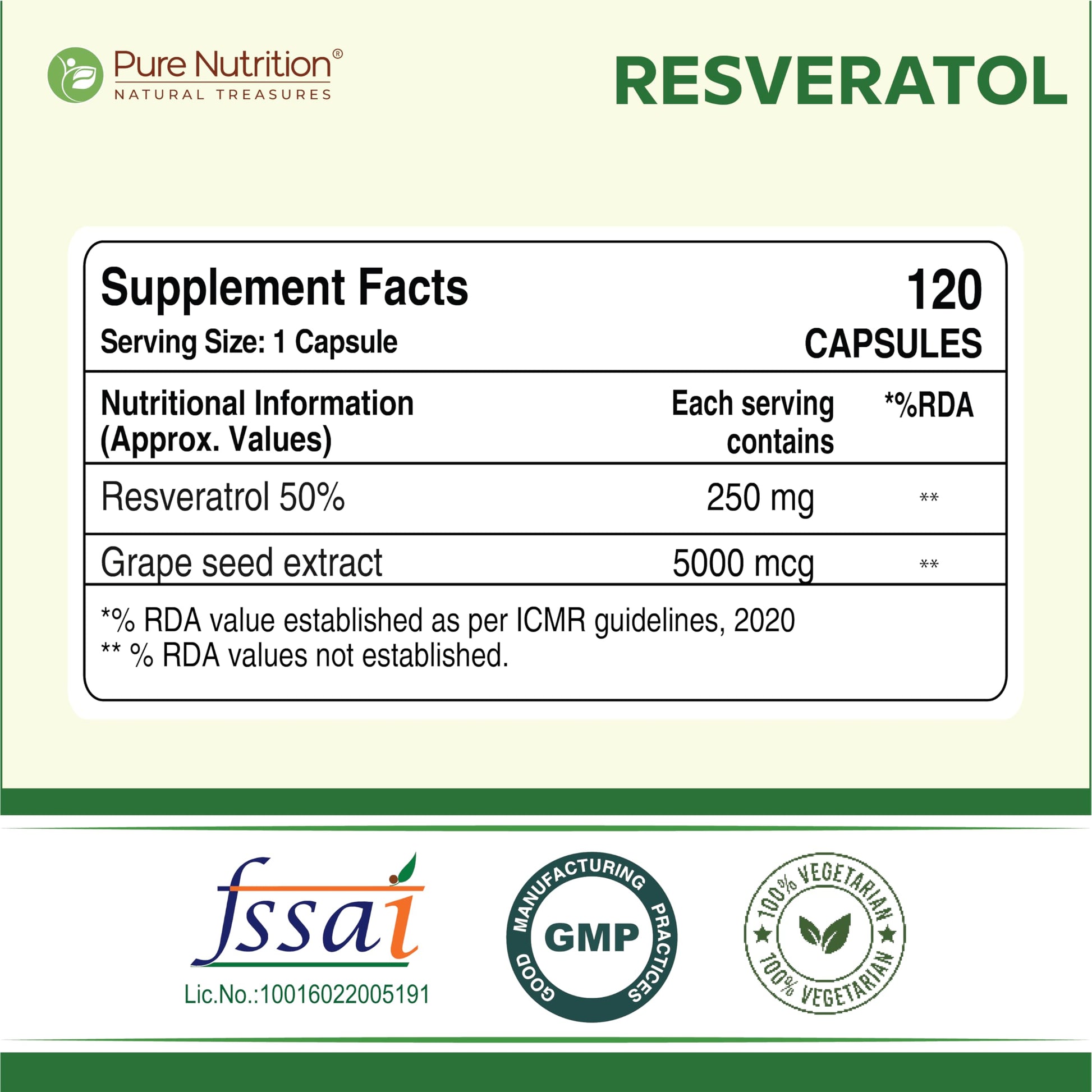 Pure Nutrition Resveratrol 255mg - 120 Veg Capsules | Powerful Antioxidant for Anti-Aging, Heart Health & Immunity | With Grape Seed Extract for Skin Radiance, Cellular Health & Healthy Aging | Supports Joint & Brain Function