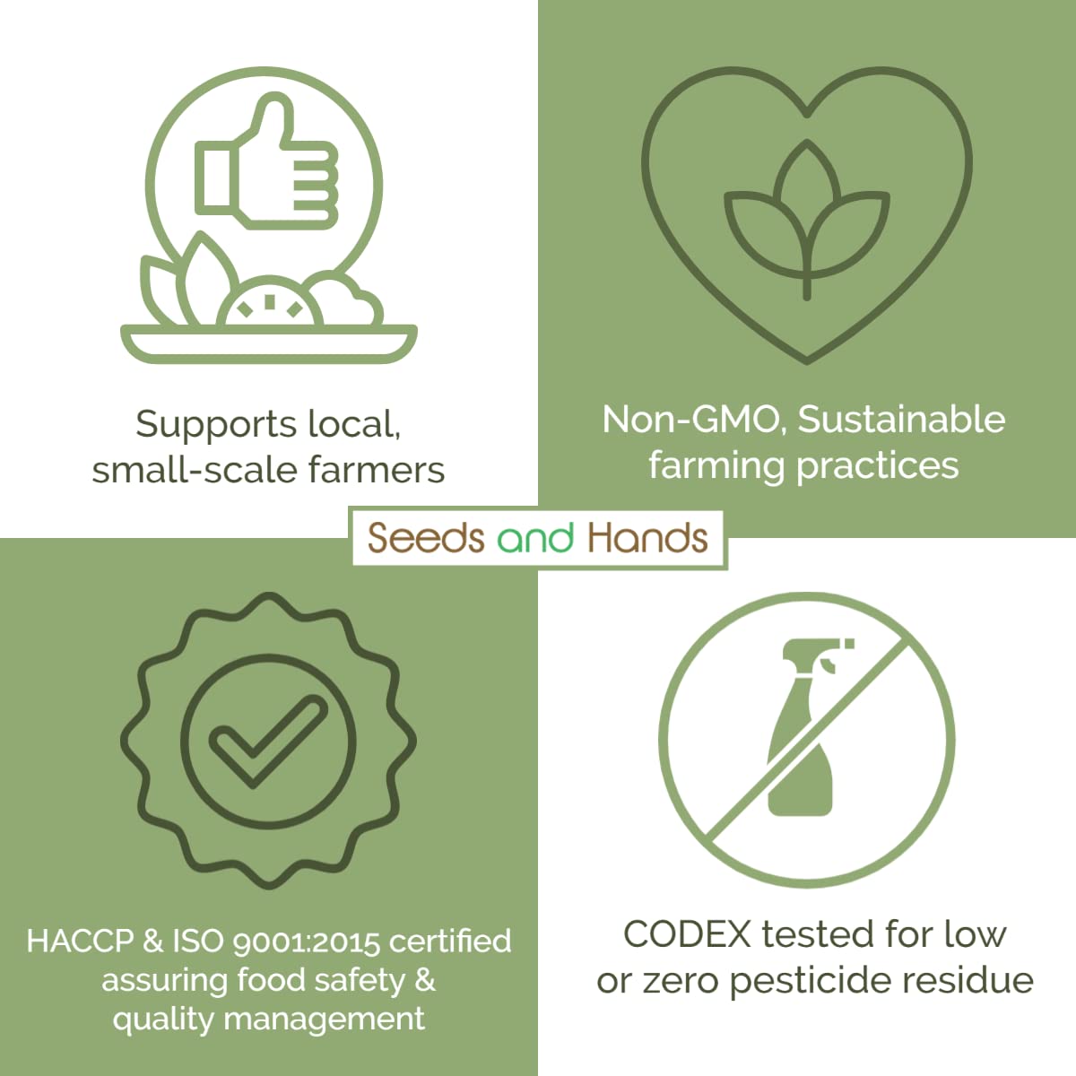 - We follow Internationally accepted food standards such as - CODEX testing to ensure low or no pesticide residue, ISO 9001:2015 to ensure quality management, and HACCP for Food safety assurance.