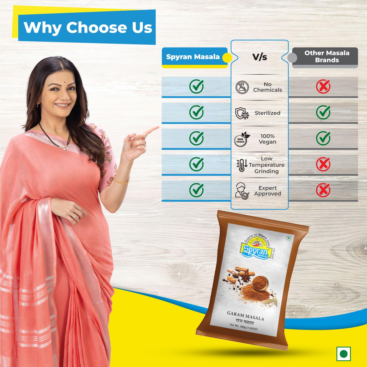 - Spyran garam masala is made from a unique blend of the highest-quality, handpicked spices, ensuring a robust and aromatic flavor profile. It delivers a pure and authentic taste free from artificial additives and preservatives.
