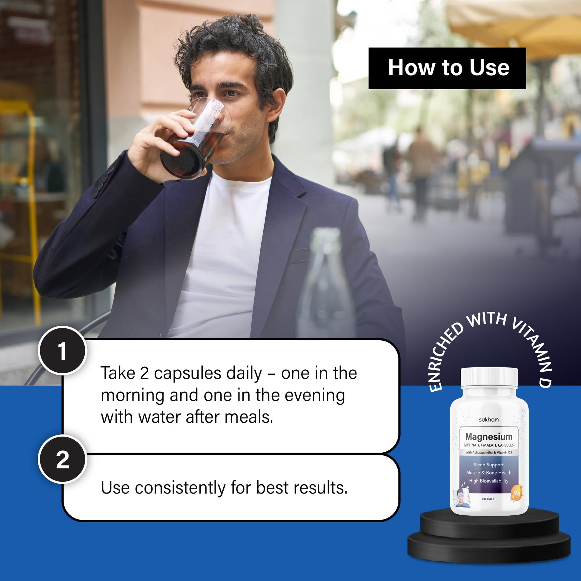 Sukham Magnesium Glycinate + Malate Capsules | 60 caps - 30 days | High Absorption Supplement | Helps with Better Sleep, Muscle & Bone Health | With Ashwagandha and Vitamin D3 | For Men & Women