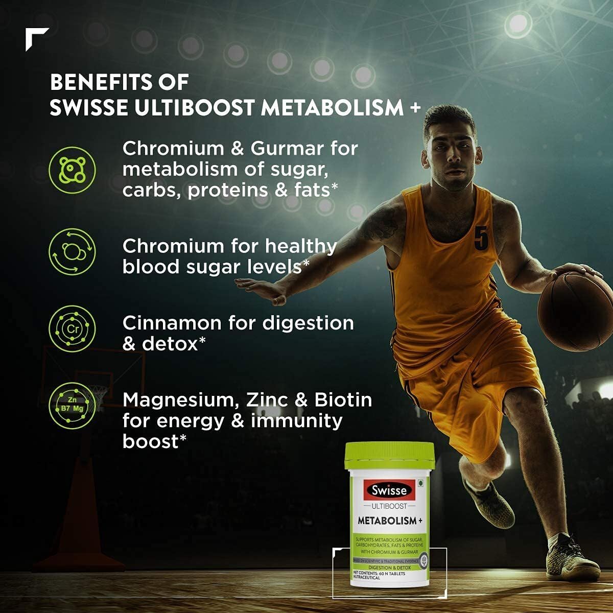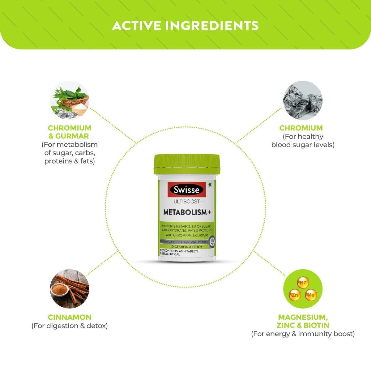 - NATURAL METABOLISM SUPPLEMENT: Swisse Ultiboost Metabolism + is a daily use supplement to support your metabolism needs. It has enriched Chromium and Gurmar which supports healthy metabolism of sugar, carbohydrates, fats and proteins. It also helps to maintain healthy blood sugar levels, ensures digestion and detoxification and boosts energy and immunity daily.