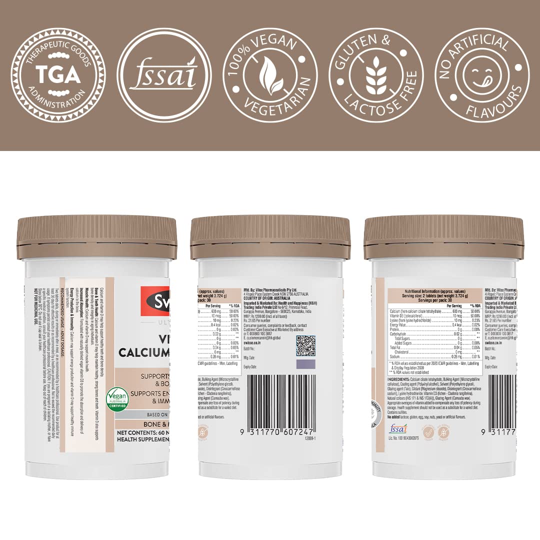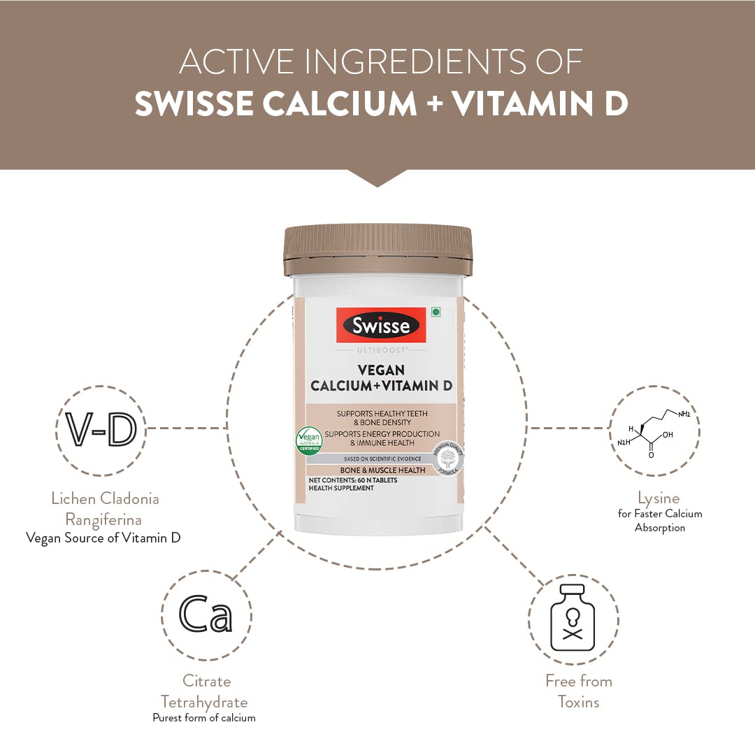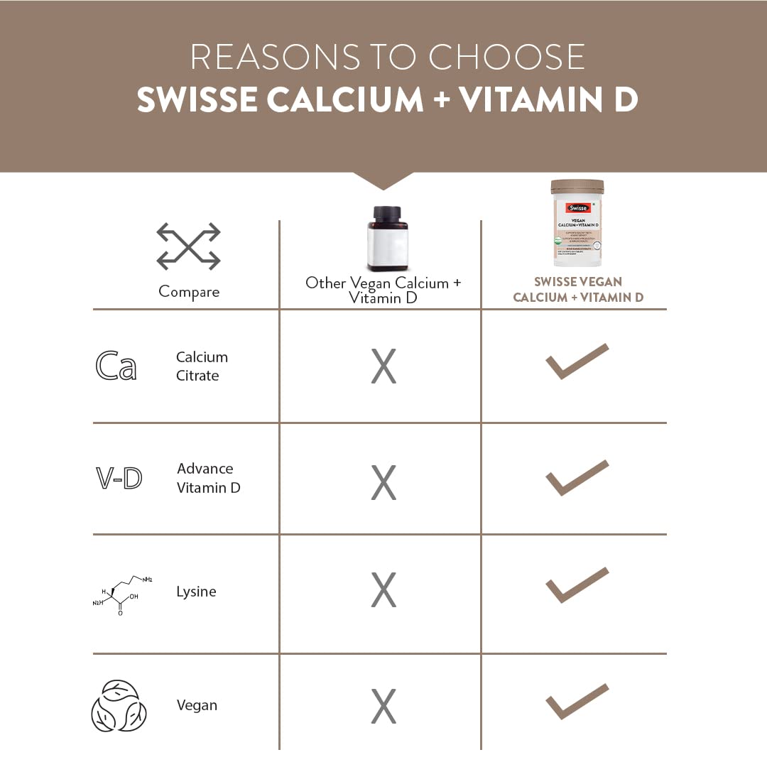 - Swisse Vegan Calcium + Vitamin D supplement provides far advanced formulation of calcium with Calcium citrate tetrahydrate form, with added Lysine, compared to any other supplement sold in market in the same category.