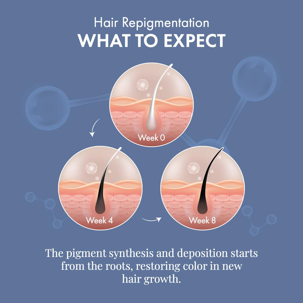 - It INHIBITS HAIR WHITENING by stimulating repigmentation of grey strands from the roots without the use of colourants.