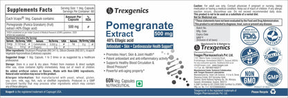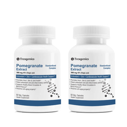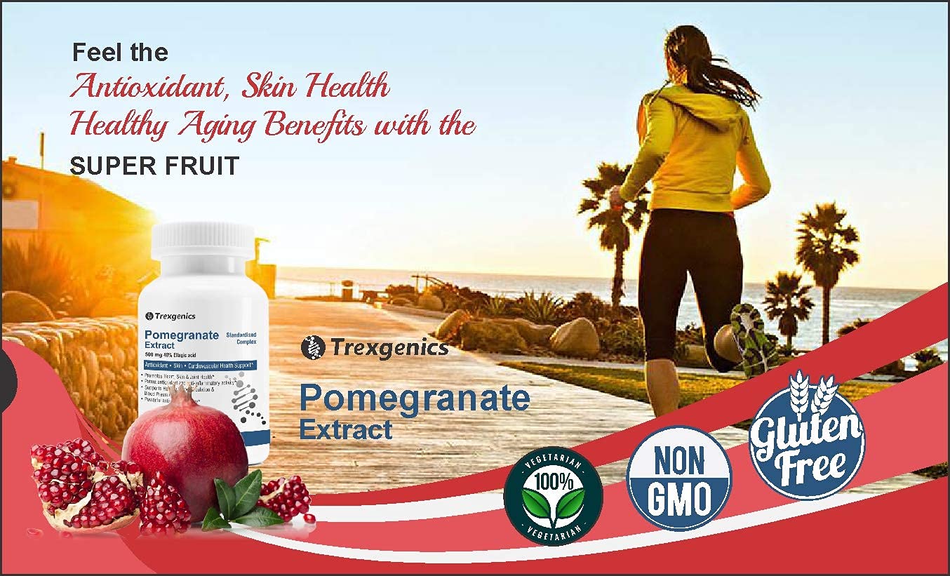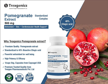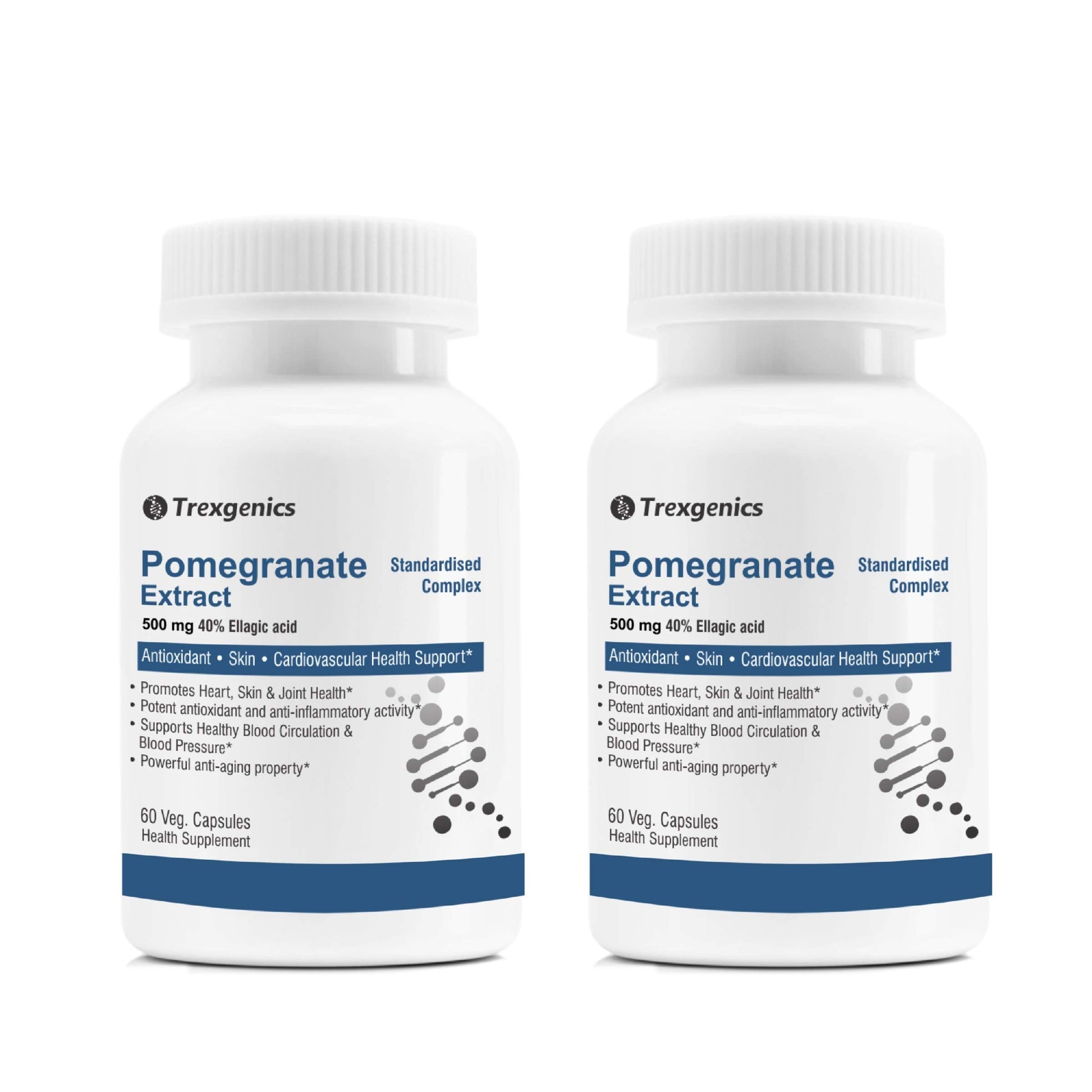 - ✓Trexgenics Pomegranate extract is a premium quality standardized complex with 40% ellagic acid, the active components responsible for its multiple benefits associated with cardiovascular health like supporting healthy cholesterol & triglyceride levels, blood pressure. Pomegranate extract is useful for joint pain relief, supporting healthy skin, system health in men, boost immunity, sooth stomach aches.*