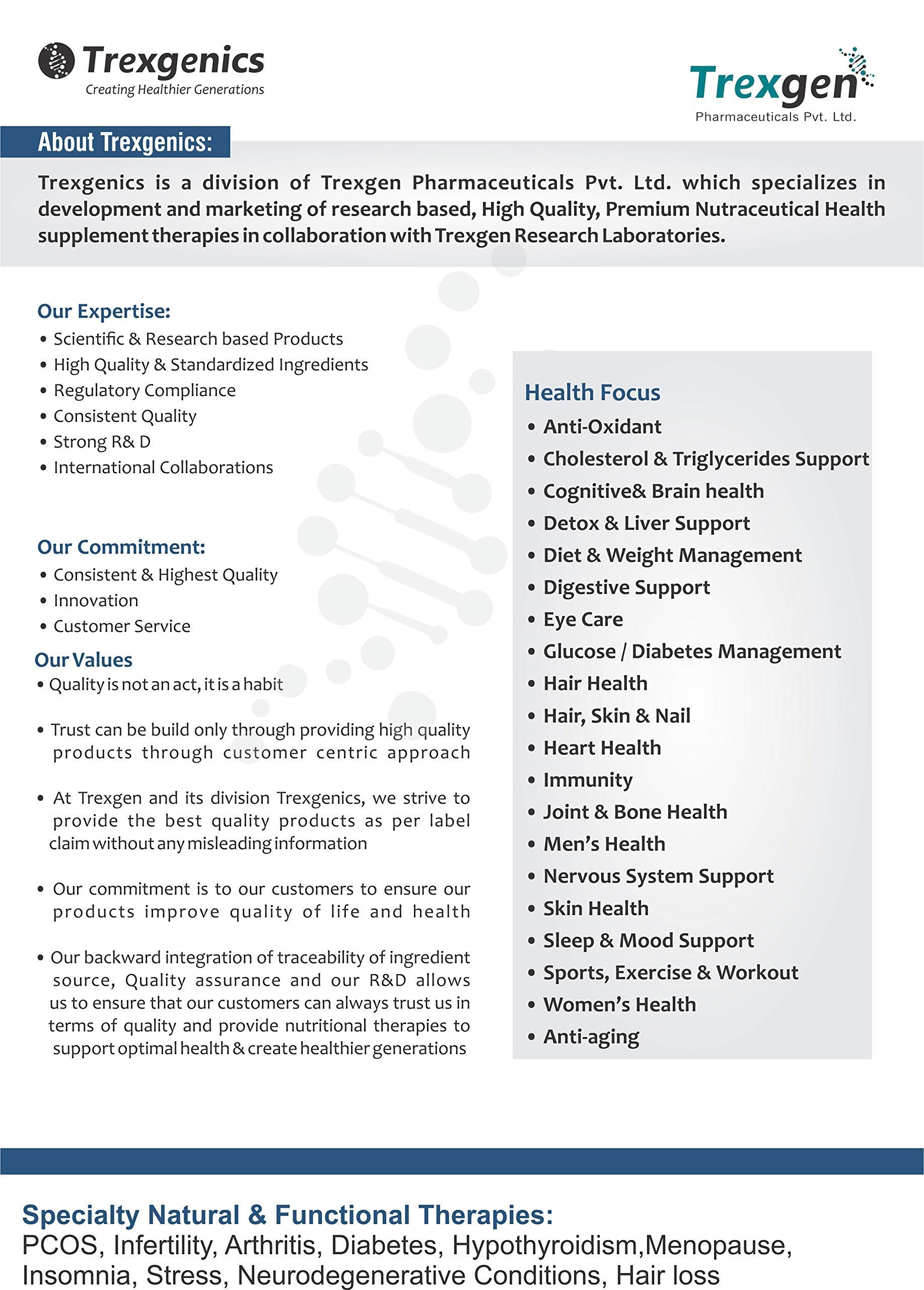 - ✓Trexgenics is a premium scientifically researched ingredients brand that can be trusted for its quality, being a brand of Trexgen Pharmaceuticals Pvt. Ltd. Quality is the cornerstone & Hallmark of our company's policy. Trexgen provides PREMIUM QUALITY Products to support optimal daily health through scientifically researched products with customer satisfaction.