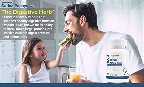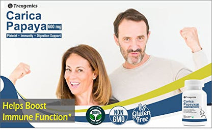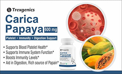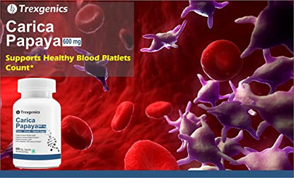 - Trexgenics Carica Papaya leaf 600 mg is used for Supports Healthy Platelet count, improve digestion and immunity. Trexgenics utilizes premium quality Carica papaya leaf extract for maximum benefits.