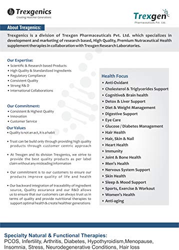 - ✓Trexgenics is a premium scientifically researched ingredients brand that can be trusted for its quality, being a brand of Trexgen Pharmaceuticals Pvt. Ltd. Quality is the cornerstone & Hallmark of our company's policy. Trexgen provides PREMIUM QUALITY Products to support optimal daily health through scientifically researched products with customer satisfaction.