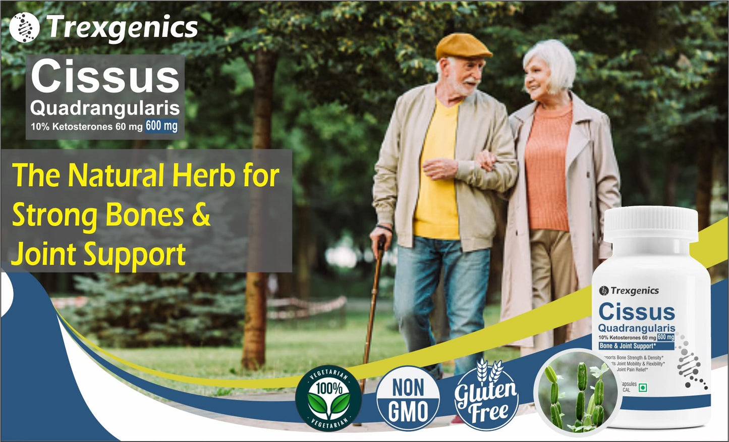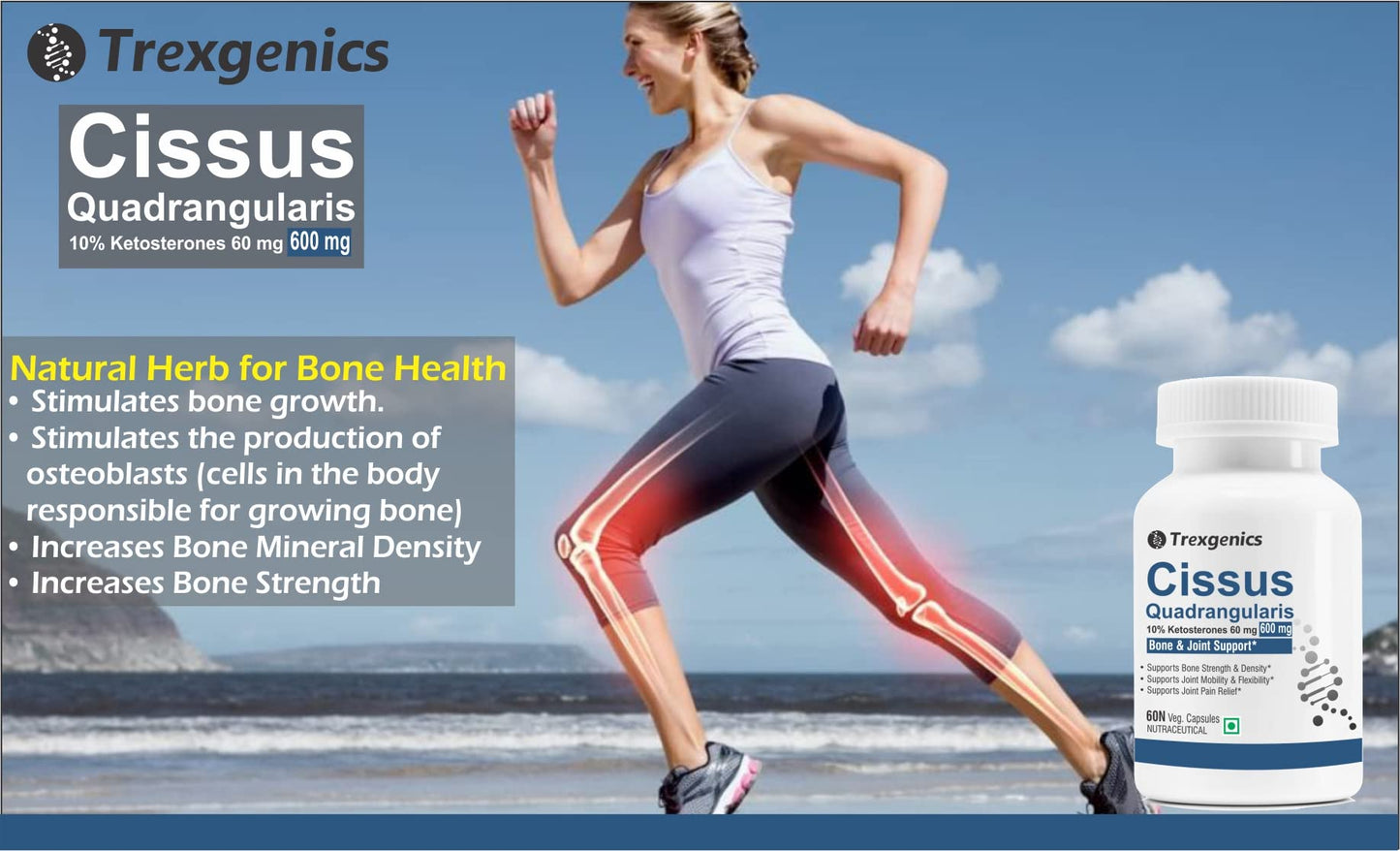 - Trexgenics Cissus quadrangularis 600 mg utilizes standardized Cissus wuith 10% Ketosterones is used as an herbal supplement for Bone health to improve bone mineral density by promoting bone cells growth and thus ideal for Bone fractures and bone strength as well as Joint pain relief.