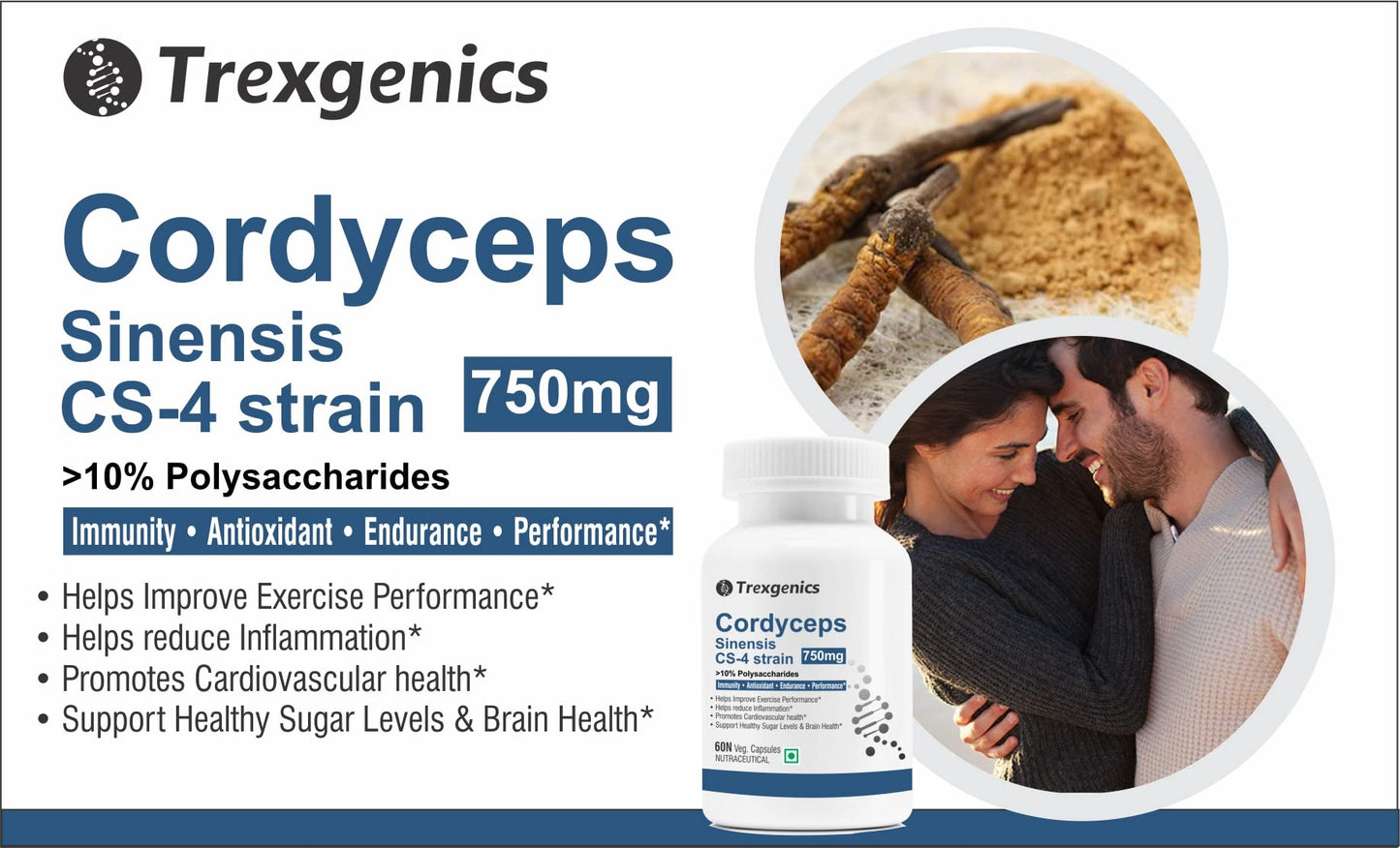 Trexgenics Cordyceps 10% Polysaccharides 750mg Immunity, Cardiovascular, Exercise performance Vegan & Non-Gmo (60 Veg Capsules)
