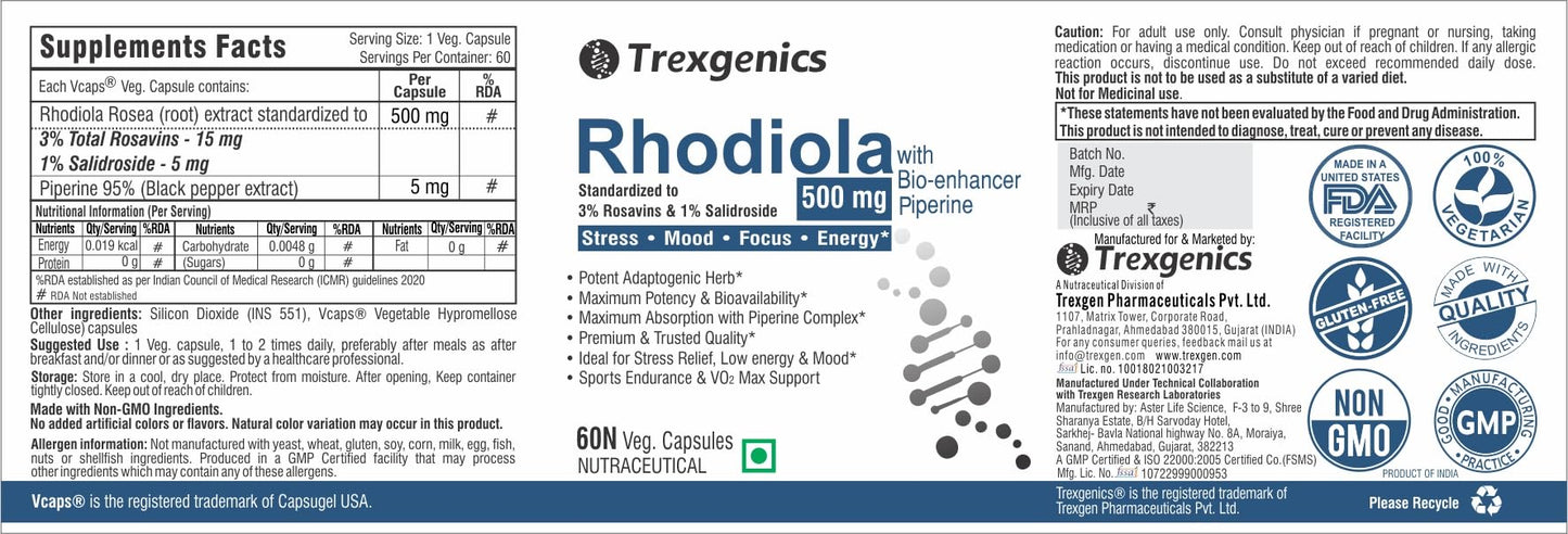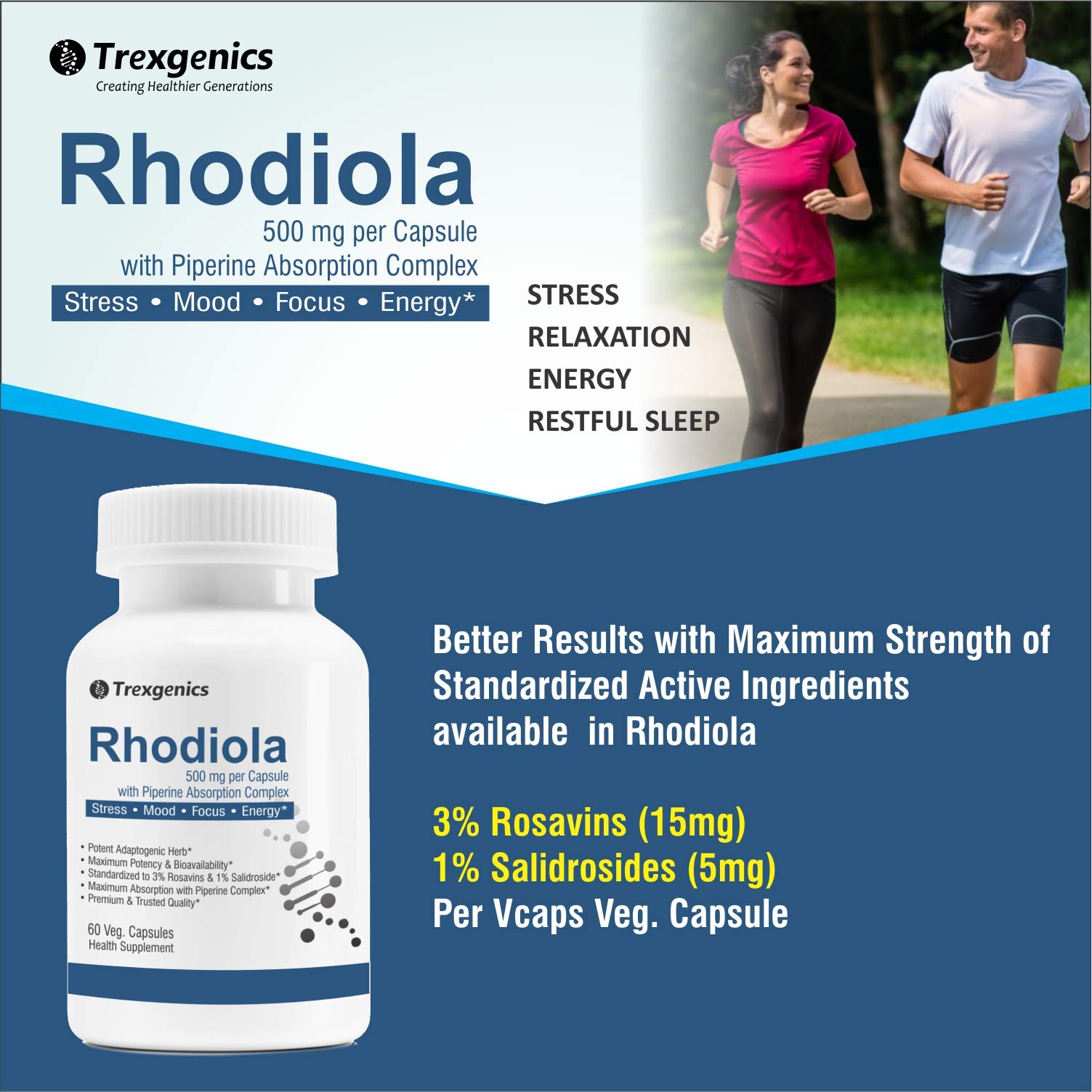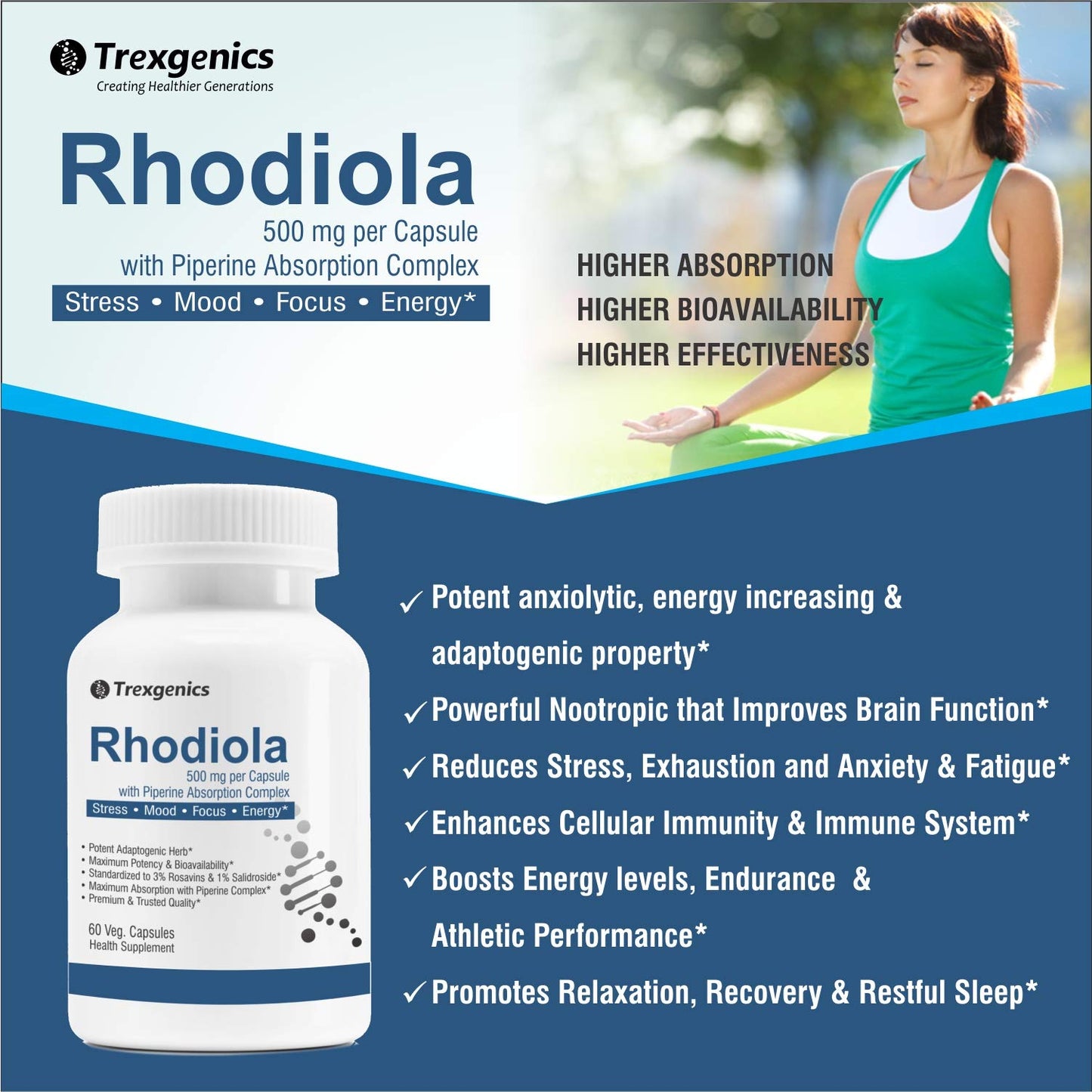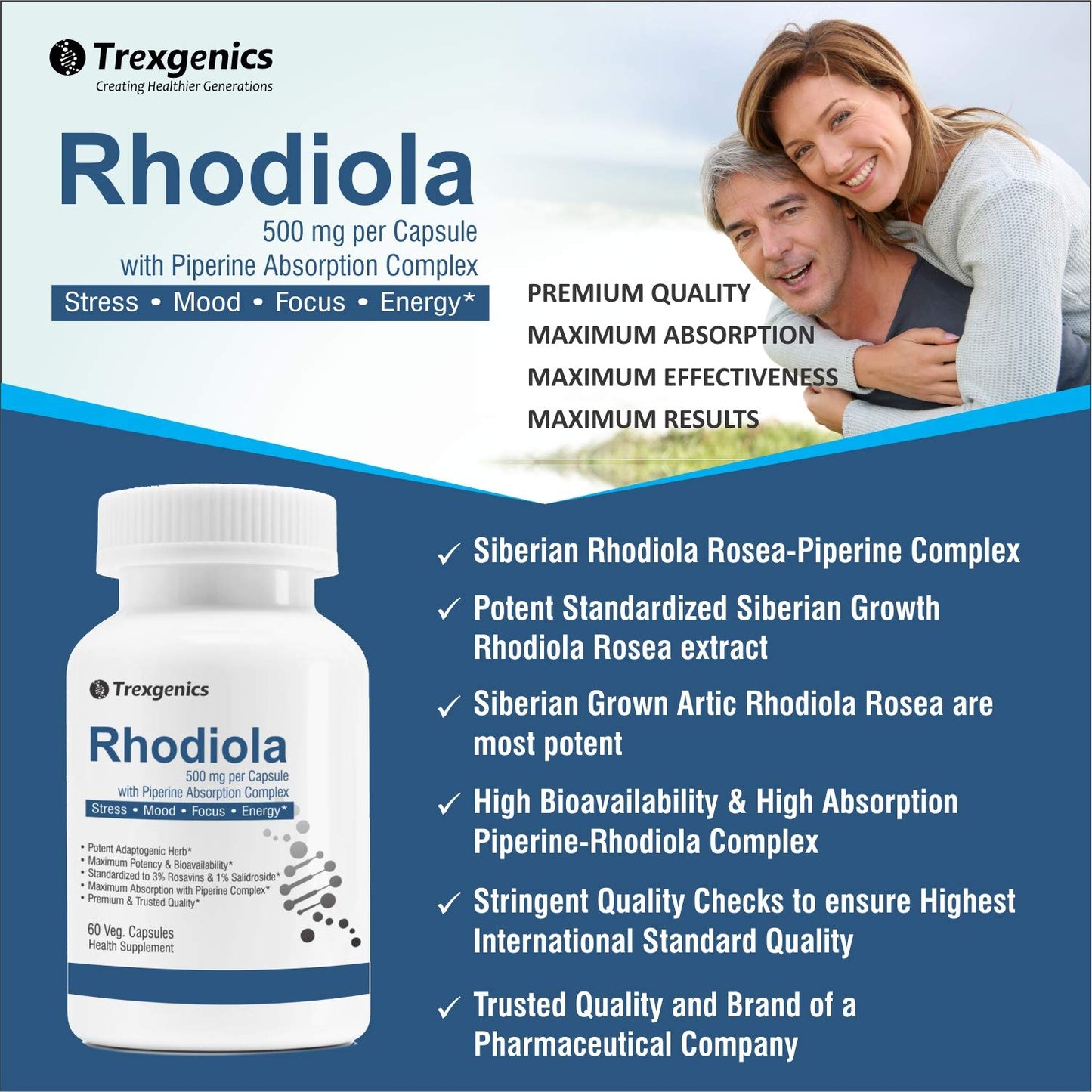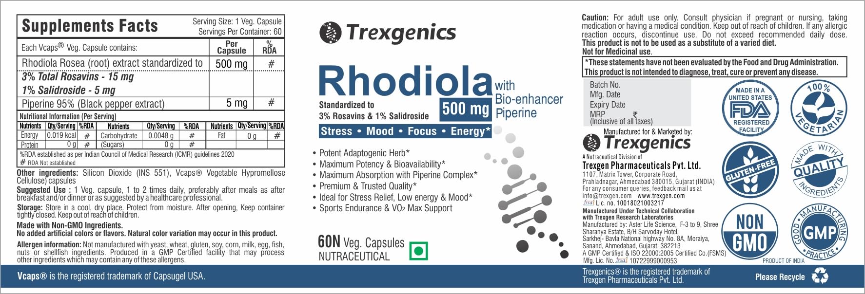 - Each Veg. Capsule of Rhodiola Rosea 500mg of Trexgenics has 5 mg of Piperine-Black pepper extract to boost absorption and bioavailability