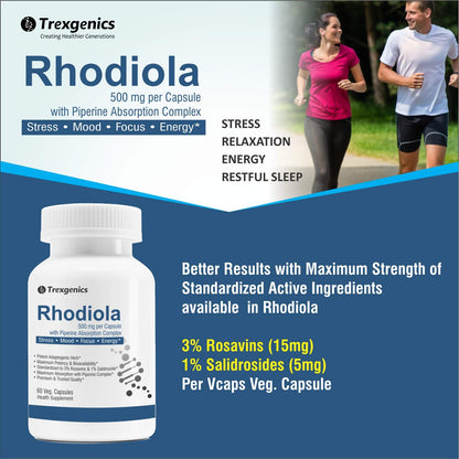- Trexgenics Rhodiola Rosea is a high quality Rhodiola-Piperine Complex which provides 500mg Rhodiola with standardized active content.
