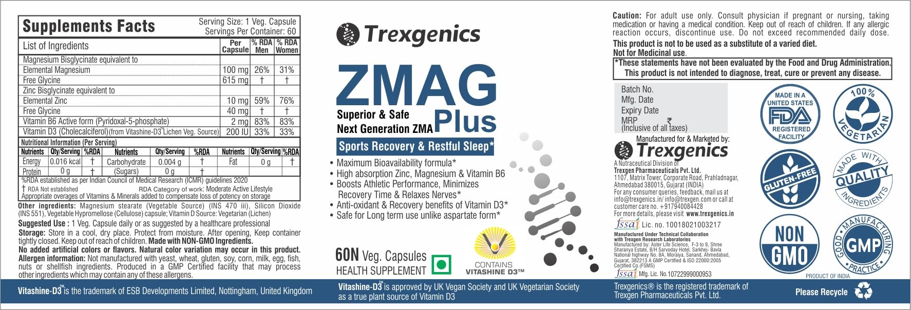Trexgenics ZMAG PLUS Next Generation Sports Recovery, Restful Sleep complex with Bioactive Zinc & Magnesium Bisglycinate, Active B6 P5P & Vit. D3 Advanced, Bioavailable & Safe (60 Veg Capsules)