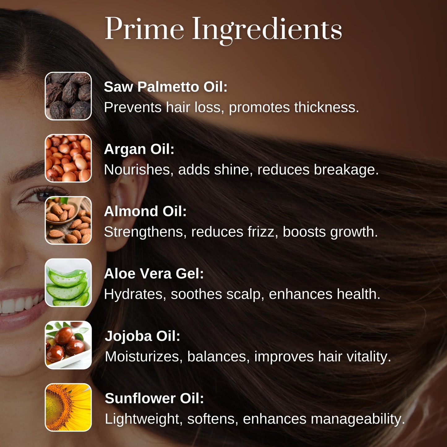 - Natural Oil Blend: Our serum features 5 premium natural oils - Argan, Almond, Saw Palmetto, Aloe Vera, and Jojoba, known for Hair Fall Control and Hair-Nourishing.