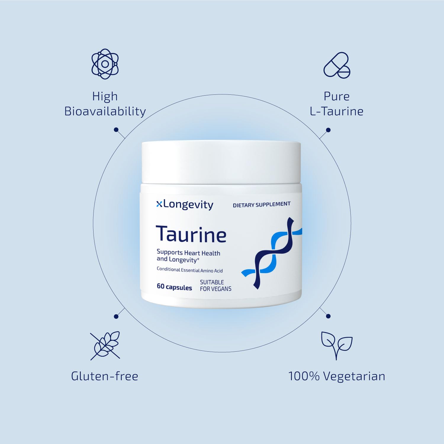 xLongevity L Taurine 1000 mg Supplement - 60 Veg Capsules for Men & Women | Lab-Tested, Muscle Recovery Support, Energy, Brain, Heart, Eye Health & Immunity - 2 tablets per day (500 mg each)