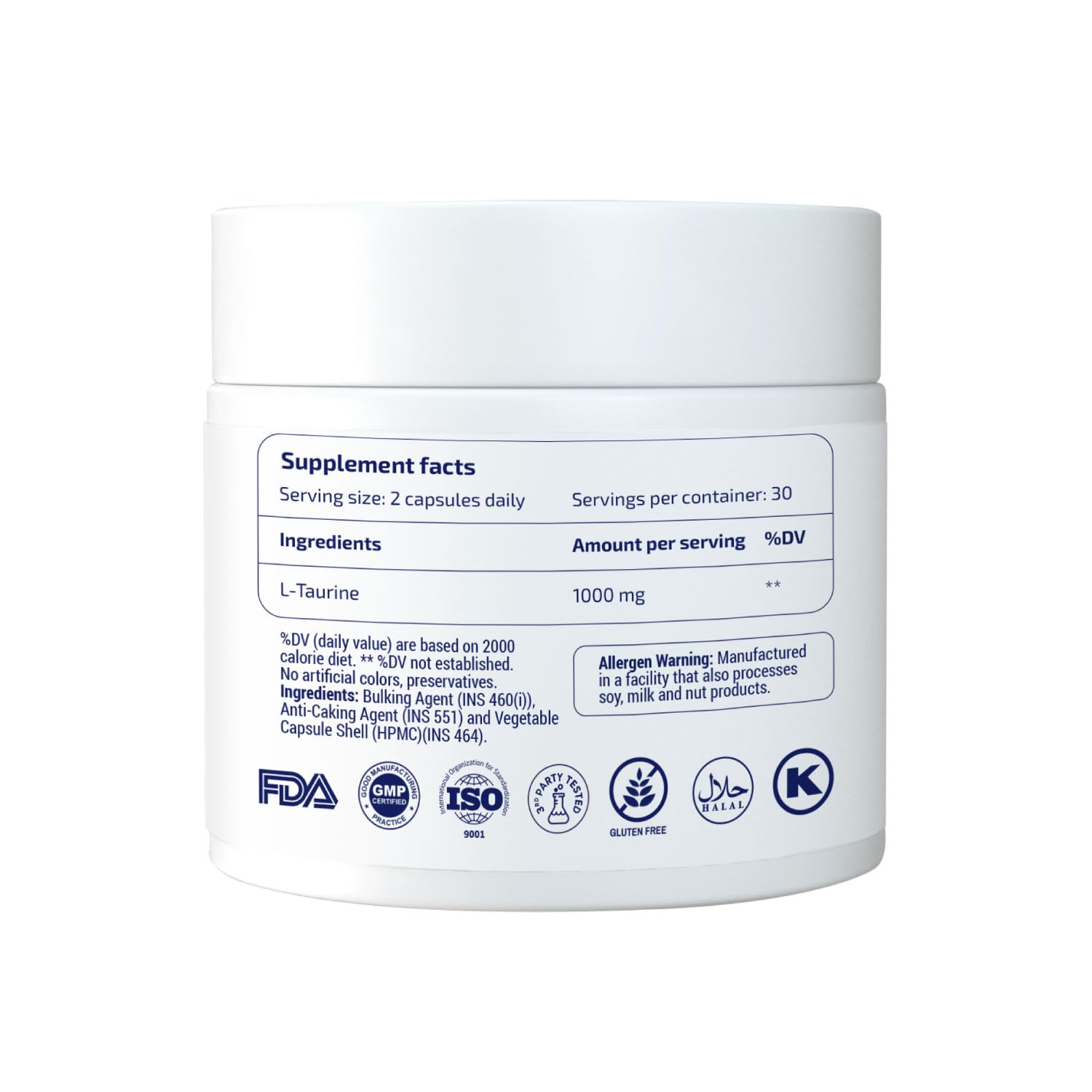 - High-Potency 500 mg Taurine - Formulated with pharmaceutical-grade L-Taurine, each serving delivers a strong dose of 1000 mg (2 capsules/day = 1 Serving) to support heart function, nervous system health, and muscle recovery.