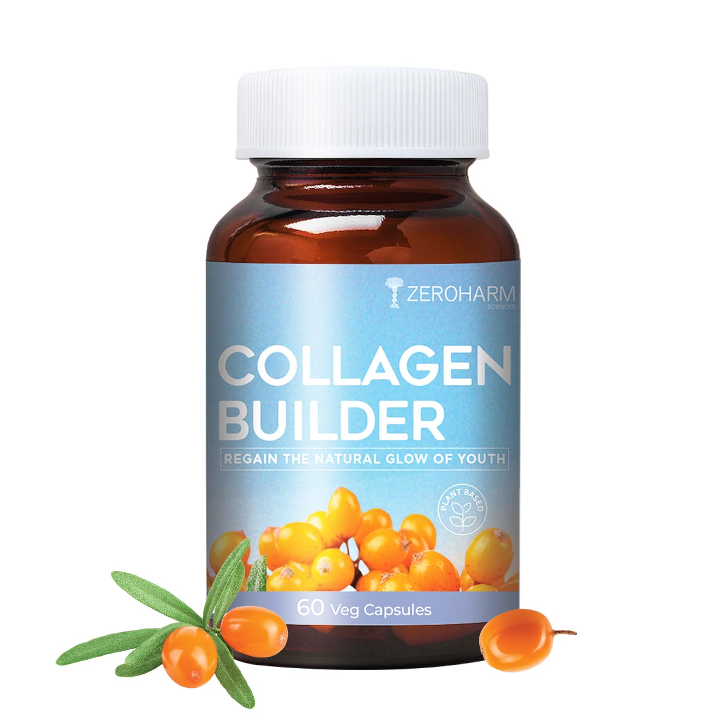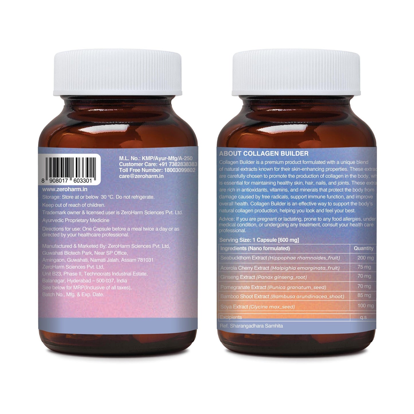 - ZEROHARM COLLAGEN BUILDER, DE-AGE NATURALLY. Zeroharm Collagen Builder is a plant-based, scientifically proven anti-aging supplement. Powered with the goodness of Sea buckthorn extract, Acerola extract, Panax Ginseng root extract, Bamboo shoot extract, Pomegranate extract and Soya extract. It stimulates the body, causing it to produce collagen naturally, slowing and reversing skin ageing. Its nano formulation ensures higher absorption for higher efficacy and faster results.