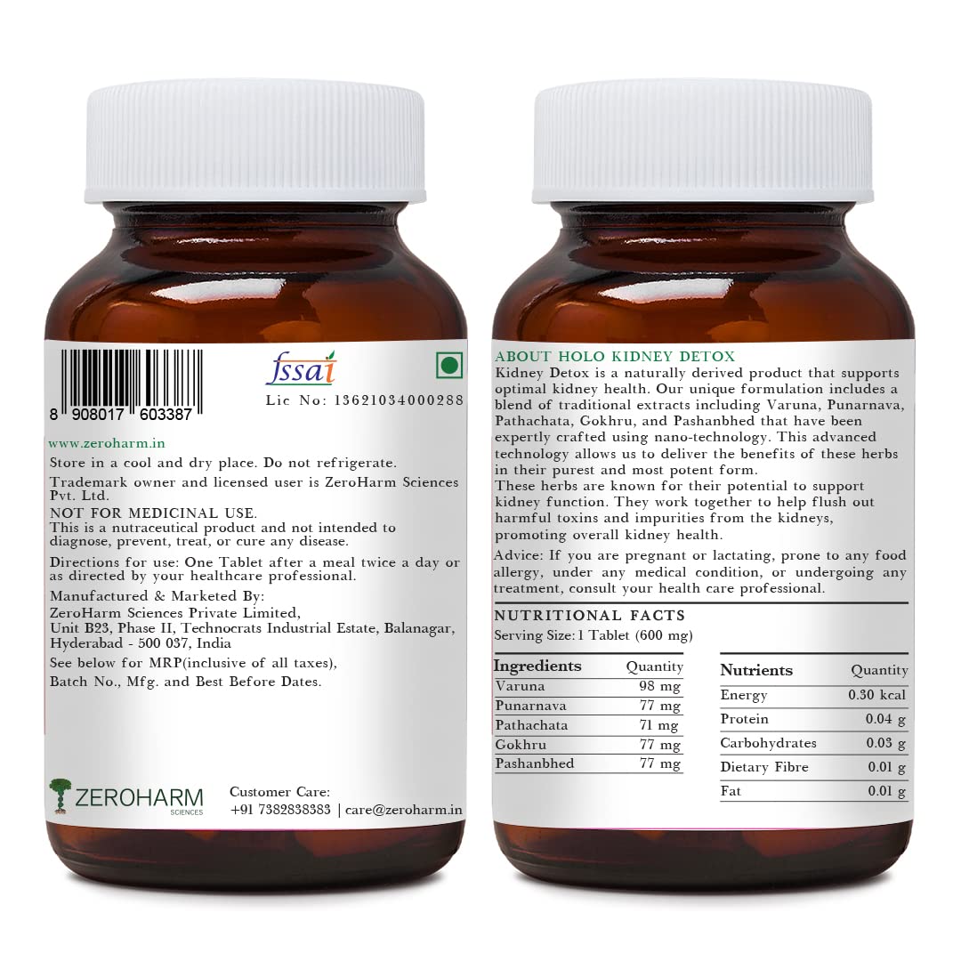 • HOLO KIDNEY DETOX, NATURE’S WAY OF CLEANSING TOXICITY Holo Kidney Detox is a plant-based, science-backed supplement. Powered with a unique formulation of rare natural extracts - Varuna, Punarnava, Patharchatta, Gokhru, and Pashanbhed to help remove toxins from the kidney, prevent kidney stones, dissolve early-stage stones, manage creatinine levels, fight kidney pain & infection, support blood purification and enhance overall kidney function.